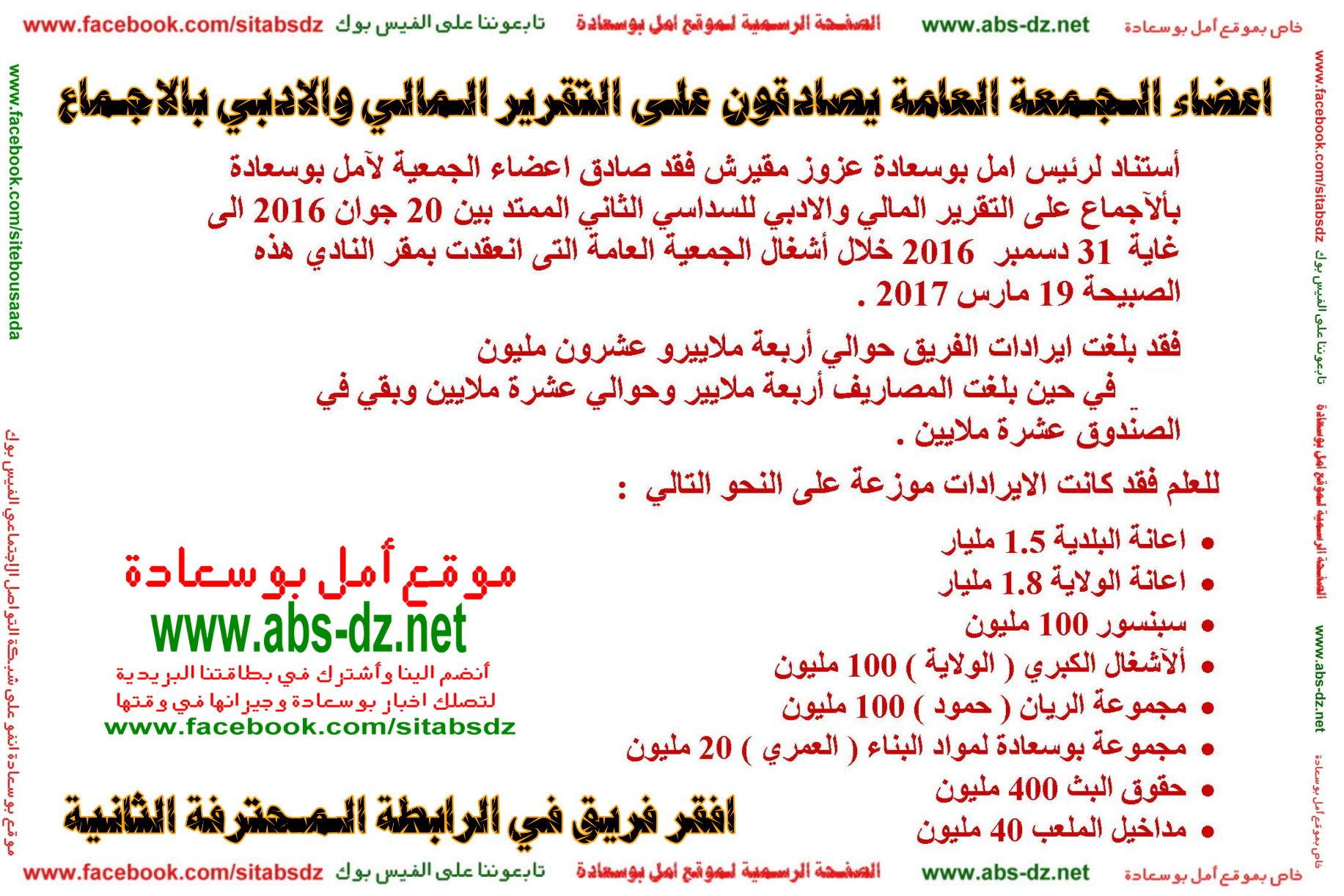 أستناد لرئيس امل بوسعادة عزوز مقيرش فقد صادق اعضاء الجمعية لآمل بوسعادة بألآجماع على التقرير المالي والادبي للسداسي الثاني الممتد بين 20 جوان 2016 الى غاية 31 دسمبر 2016 خلال أشغال الجمعية العامة التى انعقدت بمقر النادي هذه الصبيحة 19 مارس 2017 .