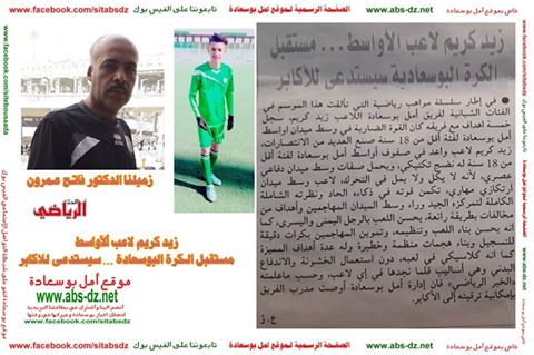 في اطار سلسلة مواهب رياضية التى يعرضها موقع امل بوسعادة لاعبنا هذه المرة زيد كريم تالق هذا الموسم سجل خمسة اهداف مع فريقه كان القوة الضاربة في وسط ميدان اواسط أمل بوسعادة لفئة أقل من 18 سنة صنع العديد من الانتصارا رفقة زملائه