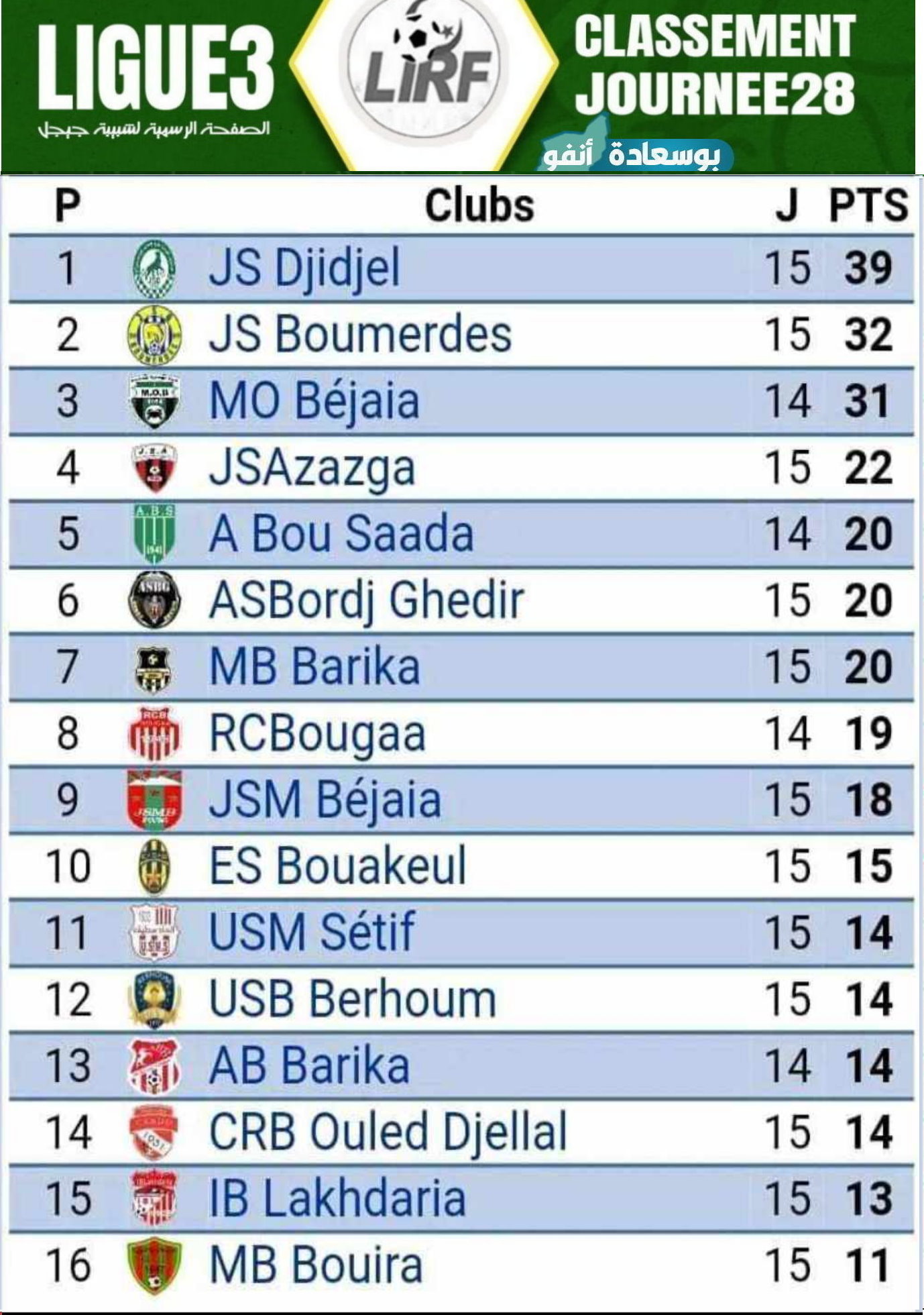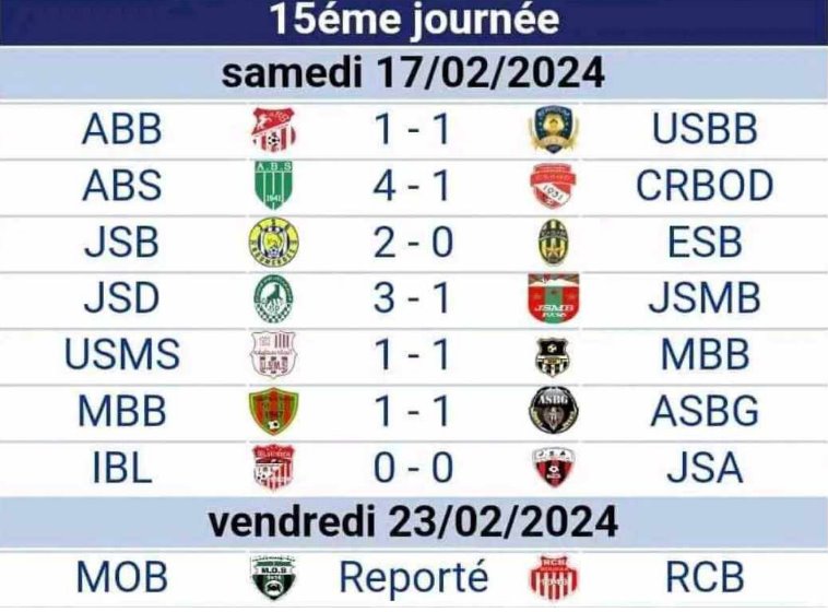 بعد فوز امل بوسعادة بميدانه برباعية لهدف واحد امام اتحاد اولاد جلال كانت بقية النتائج كالاتي مع تاجيل مقابلة الموب