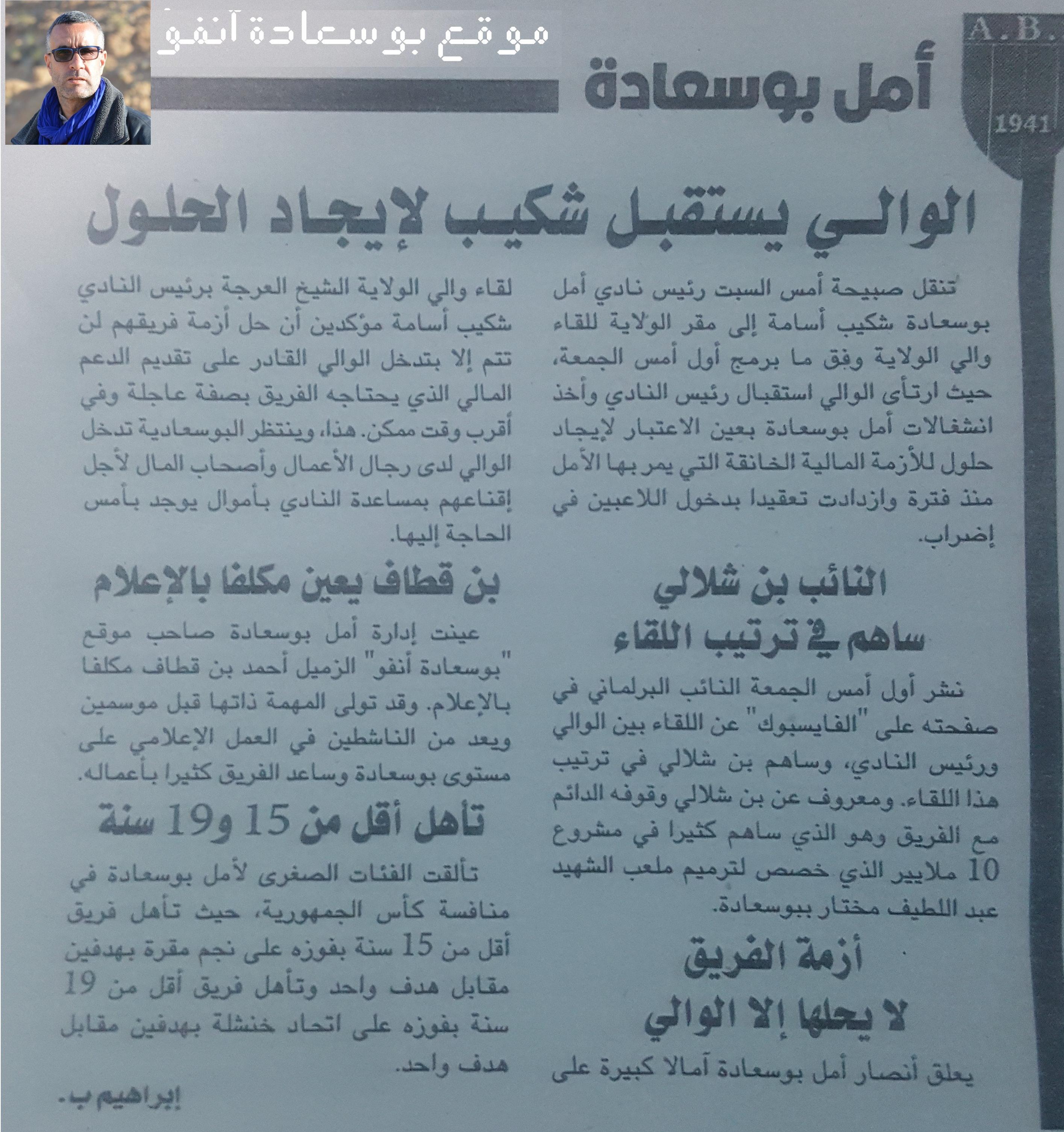 تحية لزميلنا ابراهيم بن تومي على كل المجهودات المبذولة في خدمة الرياضة في بوسعادة ومساندة لفريق امل بوسعادة مند اكثر من 20 عام