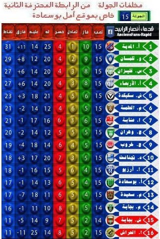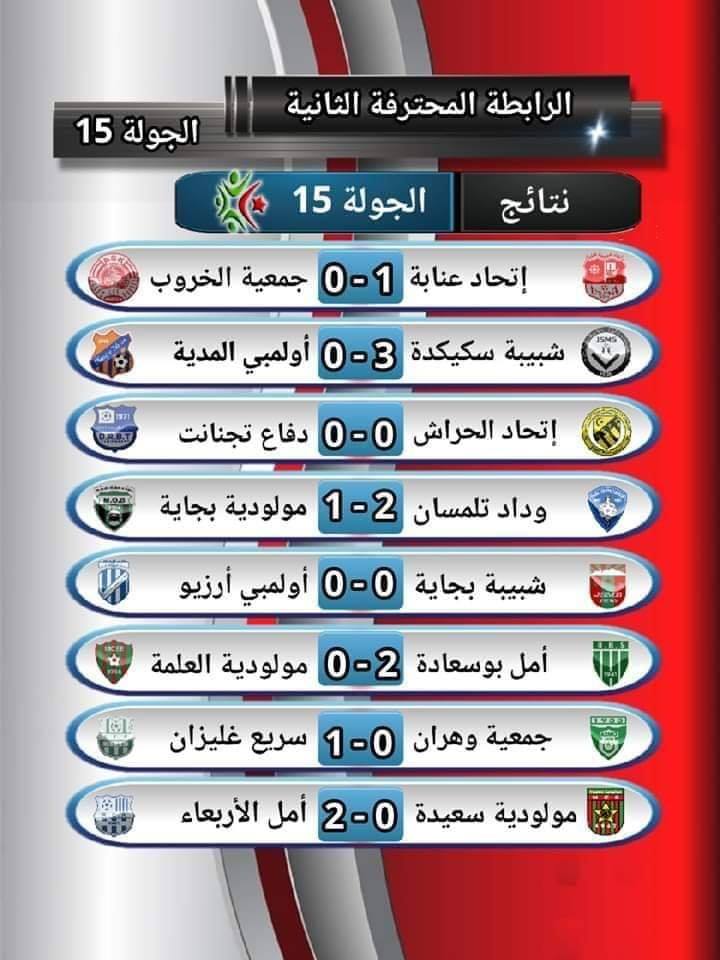من جهته حقق أمل الأربعاء فوزا ثمينا خارج الديار على مولودية سعيدة بهدفين نظيفين، ابقاه في الصف الثالث مناصفة مع سريع غليزان ب27 نقطة، مع العلم أن لاعبه بوباكور تم طرده بعد تلقيه الانذار الثاني، أما “السعيدية” فيتراجعون الى المرتبة ال12 ب17 نقطة رفقة امل بوسعادة.