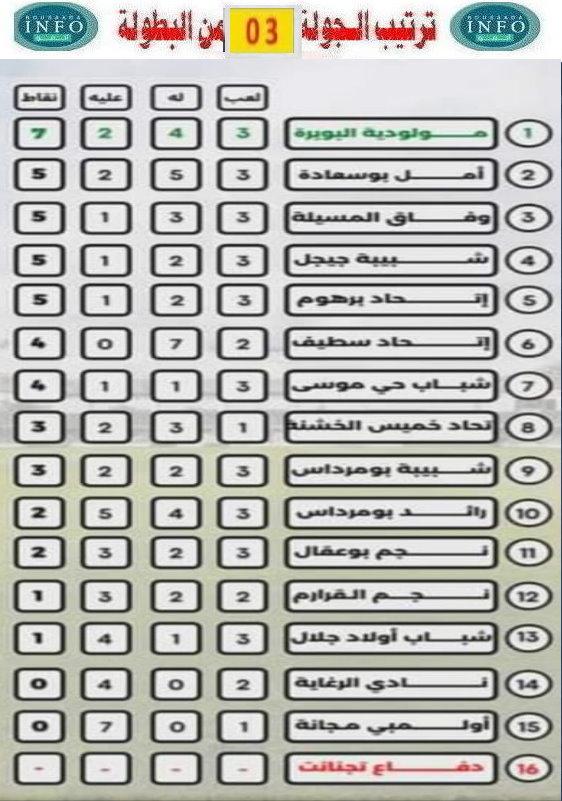 نتائج وترتيب الجولة 03 من بطولة مابين الرابطات
